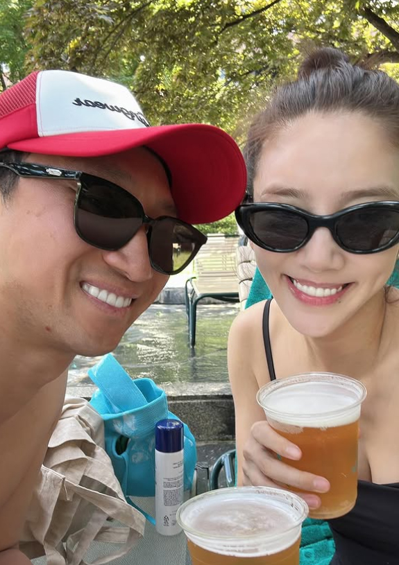 사진 속 손담비는 야외 선베드에 앉아 시원한 음료와 책을 즐기며 휴식을 취하고 있다. 검은색 슬리브리스 원피스를 입고 여유롭게 누워 있는 모습과, 남편과 함께 맥주잔을 들고 환하게 웃는 모습이 눈길을 끈다. 선글라스를 머리에 얹고 자연스럽게 미소 짓는 모습에서 오랜만의 여유와 행복이 느껴진다.