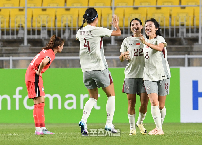중국여자축구대표팀의 웨이 야오(오른쪽)가 9일 수원월드컵경기장에서 열린 ‘EAFF(동아시아축구연맹) E-1 풋볼 챔피언십 2025’ 한국과의 경기에서 선제골을 넣은 뒤 동료들과 함께 기뻐하고 있다. 2025. 7. 9.