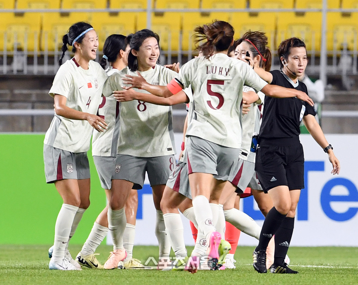 중국여자축구대표팀의 웨이 야오(가운데)가 9일 수원월드컵경기장에서 열린 ‘EAFF(동아시아축구연맹) E-1 풋볼 챔피언십 2025’ 한국과의 경기에서 선제골을 넣은 뒤 동료들과 함께 기뻐하고 있다. 2025. 7. 9.
