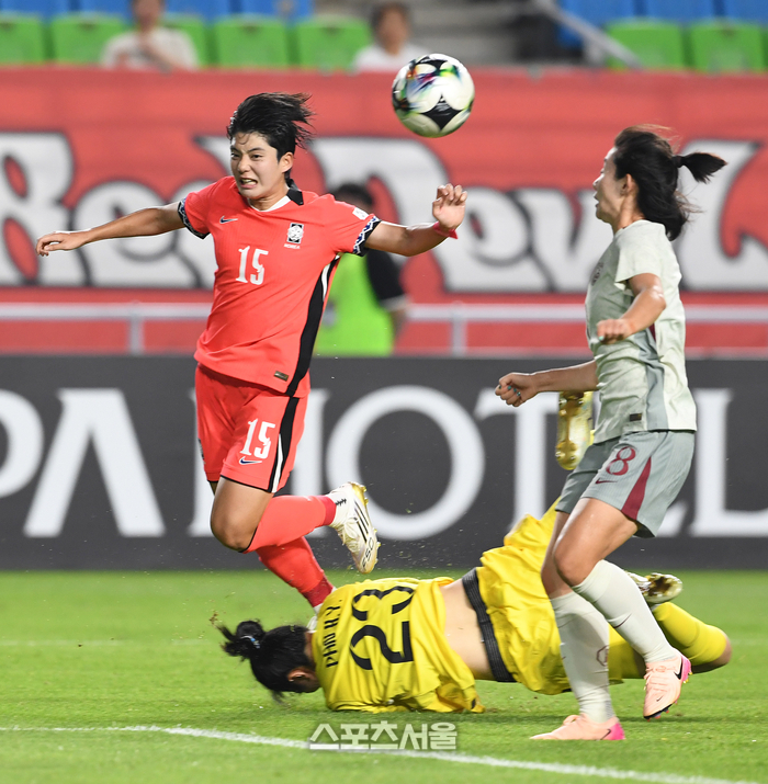 한국 여자축구대표팀의 전유경(왼쪽)이 9일 수원월드컵경기장에서 열린 ‘EAFF(동아시아축구연맹) E-1 풋볼 챔피언십 2025’ 중국과의 경기에서 슛을 했으나 중국 골키퍼 선방에 막히고 있다. 2025. 7. 9.