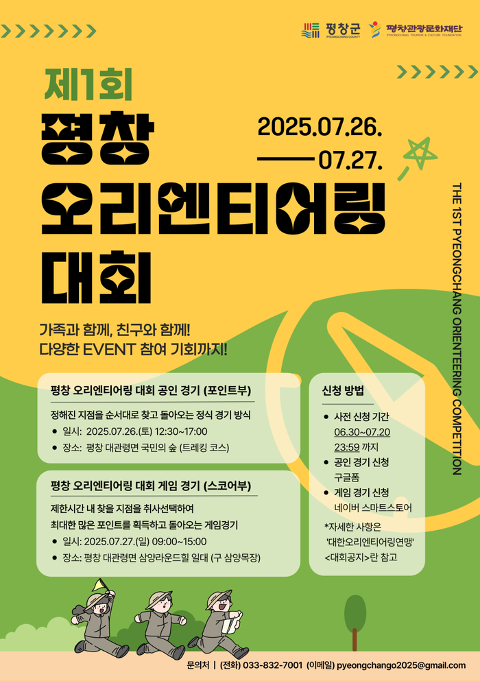 이번 오리엔티어링은 정해진 순서대로 목표 지점을 빠르게 찾아가는 ‘공인 경기(포인트부)’와, 주어진 시간 내 최대한 많은 포인트를 찾는 ‘게임 경기(스코어부)’로 진행된다. 평창군 대관령의 청정 자연과 올림픽 개최지라는 역사적 의미를 접목한 체험형 콘텐츠로, 참여자들에게 다양한 혜택은 물론 색다른 즐거움을 선사할 예정이다.