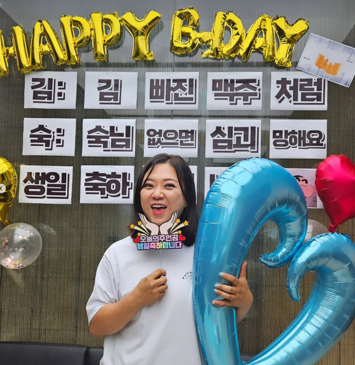 또 다른 사진에는 “HAPPY B-DAY” 풍선과 축하 메시지로 꾸며진 벽 앞에서 풍선을 들고 기념 촬영을 하고 있다.