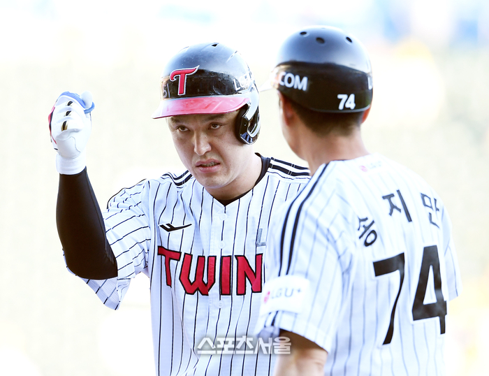 LG 박동원이 10일 잠실구장에서 열린 2025 KBO리그 키움과의 경기 1회말 2사 2루 상황에서 키움 선발투수 알칸타라를 상대로 1타점 적시타를 친 뒤 세리머니를 하고 있다. 2025. 7. 10.