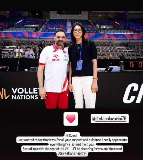 김연경은 “코치님, 그동안 보여주신 모든 지원과 지도에 진심으로 감사드립니다. 코치님께 배운 모든 것에 정말 감사하게 생각합니다. 남은 VNL도 행운이 가득하길 바라며, 감독님과 팀을 응원합니다. 항상 건강하고 행복하세요”라고 전했다.