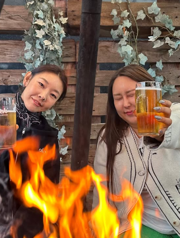 마지막 사진에서는 따뜻한 분위기의 모닥불 뒤에서 맥주잔을 들고 건배하는 모습이 담겨, 두 사람의 돈독한 우정을 느낄 수 있다.
