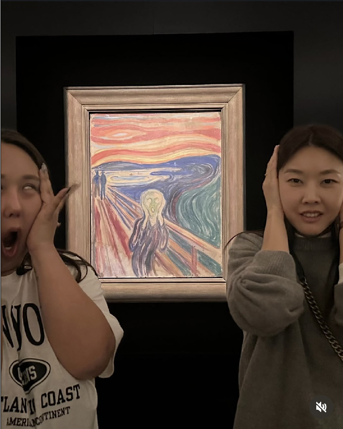 오슬로 뭉크 미술관에서 ‘절규’ 그림 앞에서 한혜진과 풍자가 그림 속 인물의 표정을 재현하며 유쾌한 분위기를 자아냈다.