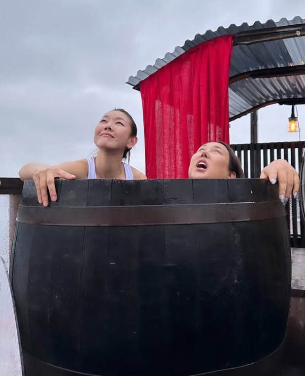또 다른 사진에서는 노천 사우나로 보이는 큰 통 안에서 얼굴만 내밀고 장난스럽게 카메라를 응시하고 있다.