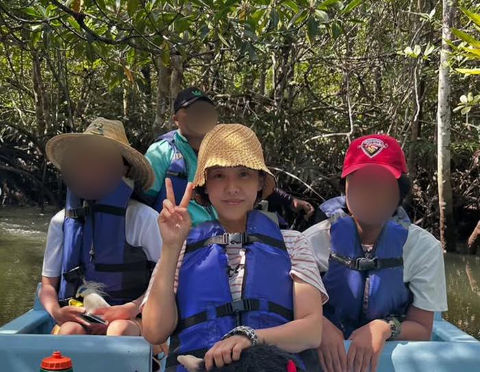 공개된 사진 속 박은혜와 쌍둥이 아들은 푸른 구명조끼를 입고 자연 속에서 여유로운 시간을 보내고 있다.
