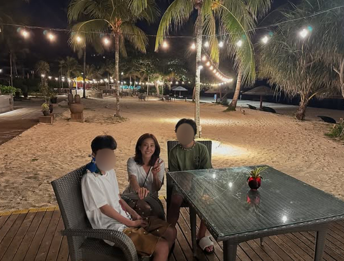 또 다른 사진에서는 해변가 야외 테이블에 앉아 밤바다를 배경으로 담소를 나누는 모습이 포착됐다. 두 아들은 훌쩍 자란 모습으로 엄마와 함께 여행의 추억을 쌓고 있다.
