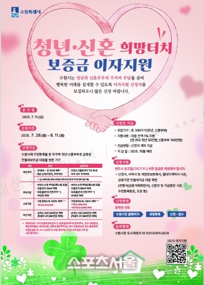 〔스포츠서울│수원=좌승훈기자〕경기 수원시는 무주택 청년·신혼부부 가구에 전월세보증금의 대출 이자 일부를 지원하는 ‘청년·신혼 희망터치 보증금 이자지원 사업’ 신청자를 오는 28일부터 8월 11일까지 모집한다.