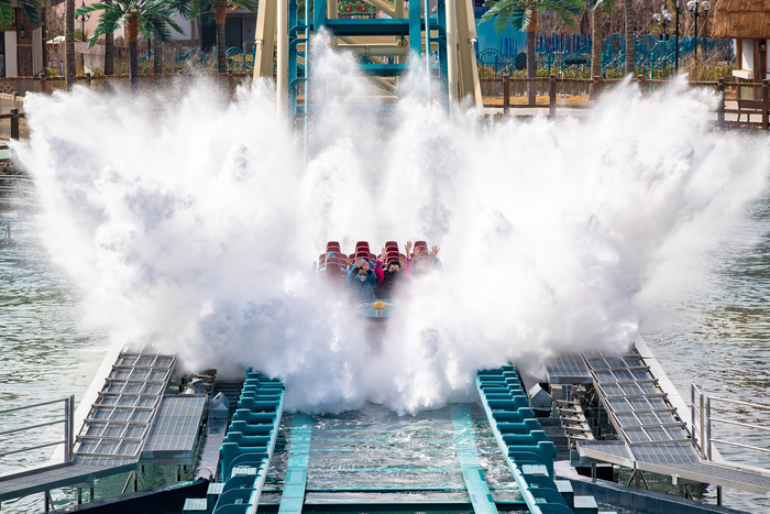 대표 어트랙션인 ‘자이언트 스플래쉬’다. ‘자이언트 스플래쉬’는 국내 최초로 도입된 롤러코스터와 후룸 라이드를 결합한 독창적인 기종이다. 44.6m높이에서 약 2000톤의 물이 담긴 수로를 향해 시속 100㎞로 급하강해 거대한 물보라를 일으키는 어트랙션으로, 마치 샤워를 한 듯 전신이 물에 흠뻑 젖는 이색 경험이 가능하다.