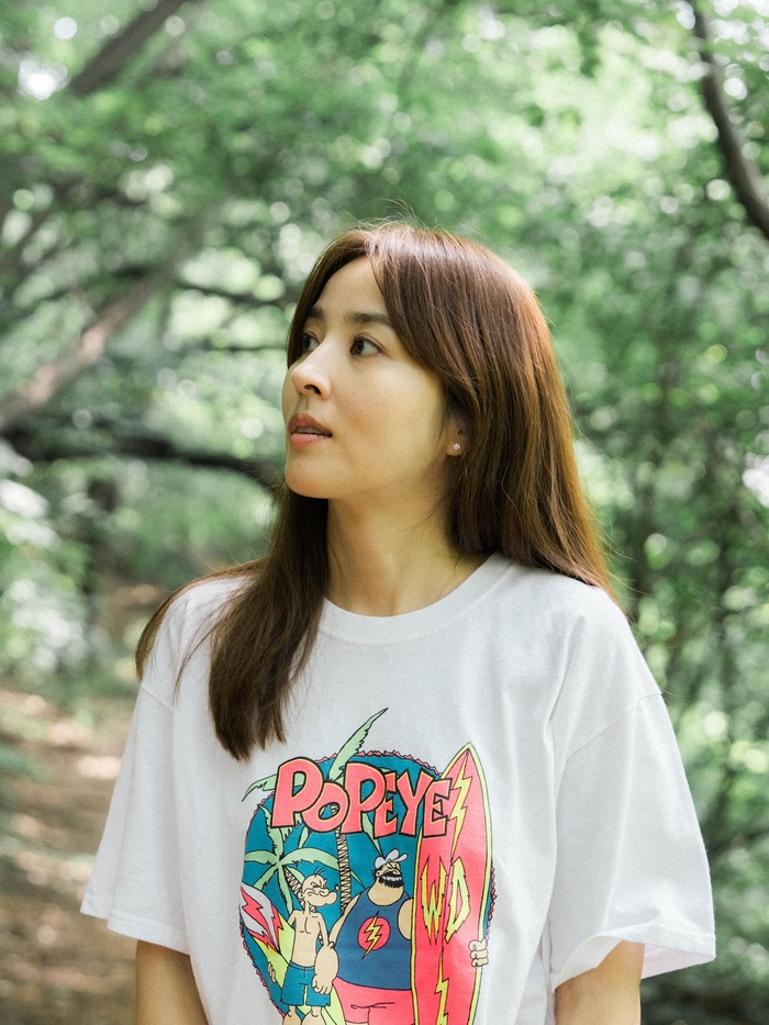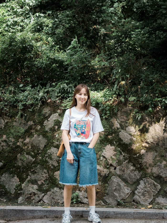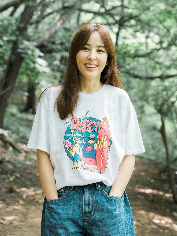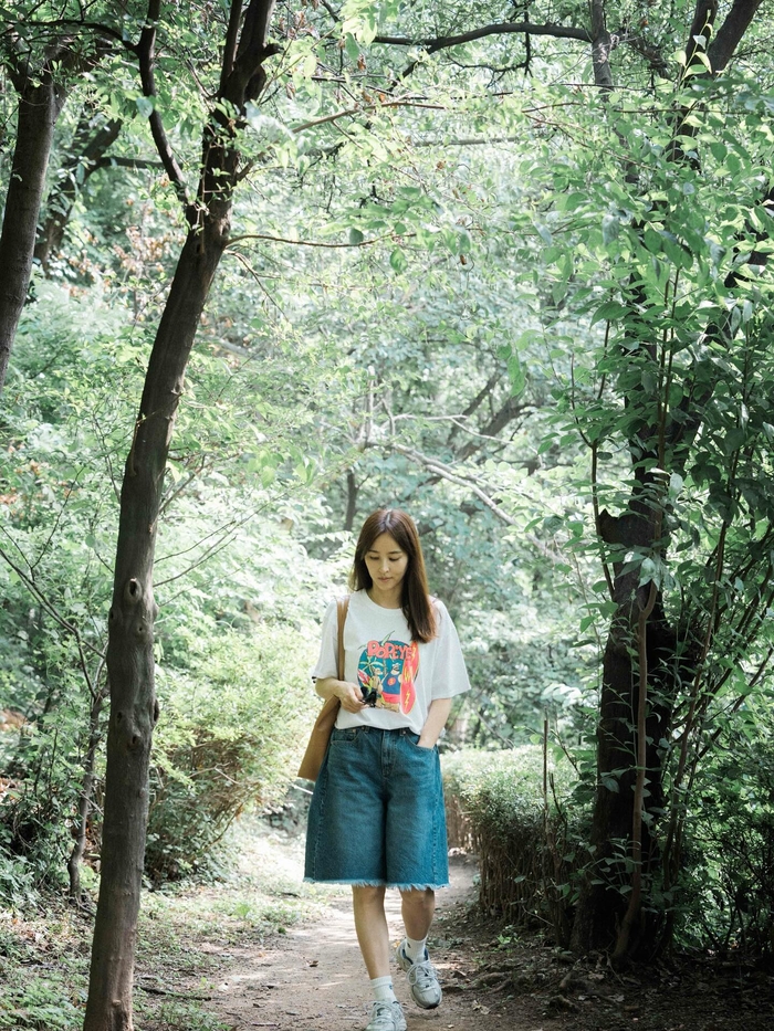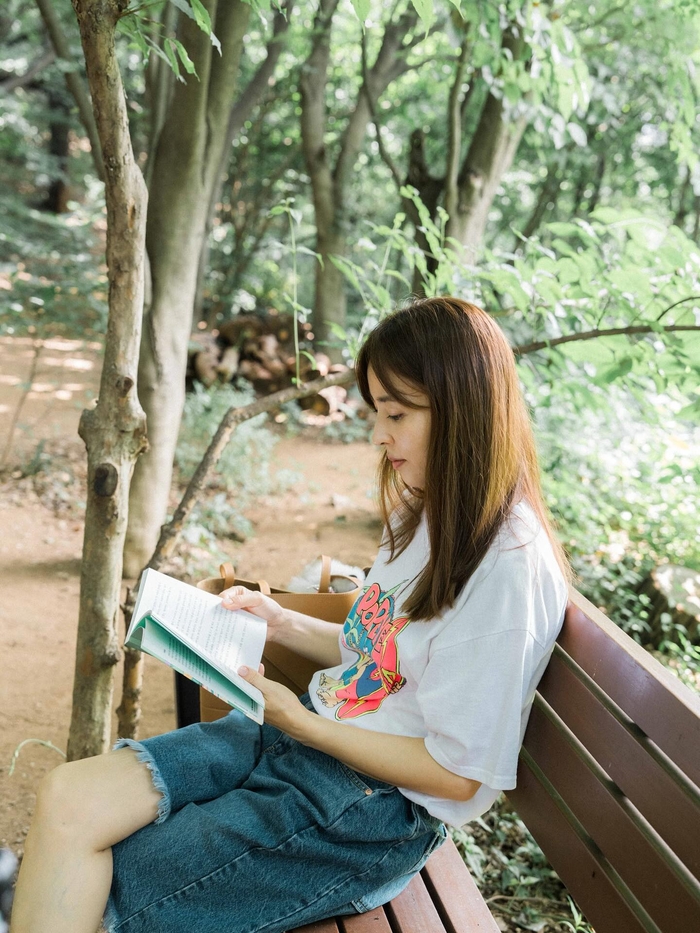 캐주얼한 흰색 프린팅 티셔츠와 데님 반바지, 운동화 차림으로 편안하면서도 산뜻한 여름 패션을 뽐냈다. 손에는 책을 들고 벤치에 앉아 독서에 몰두하는 모습도 포착되어, 자연 속에서 힐링을 만끽하는 일상이 엿보인다.
