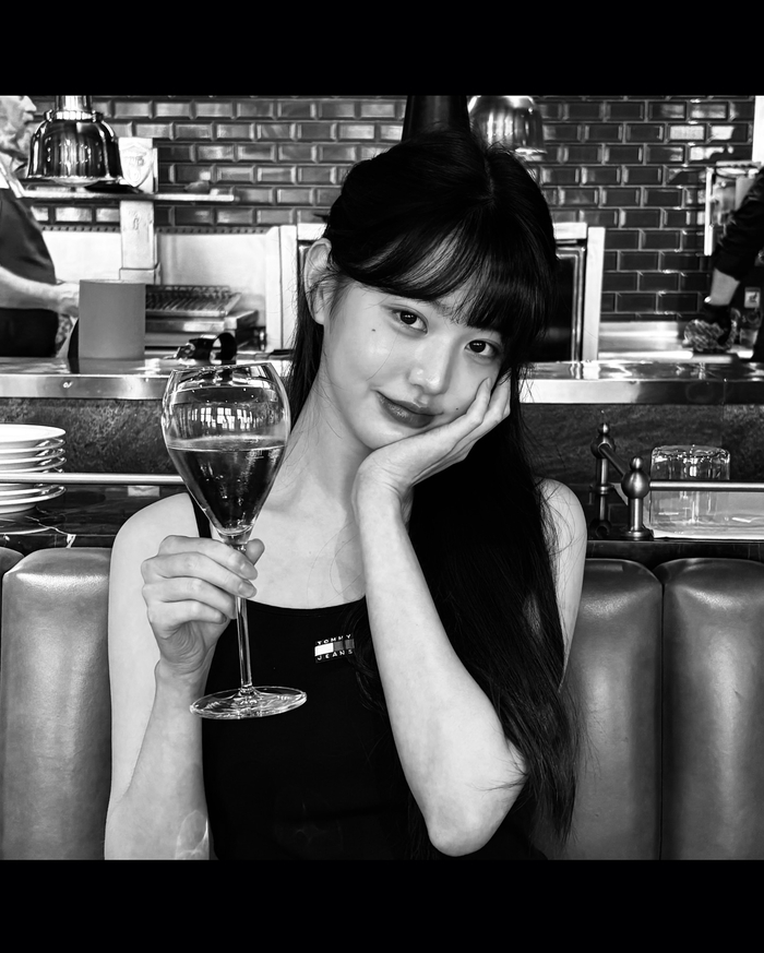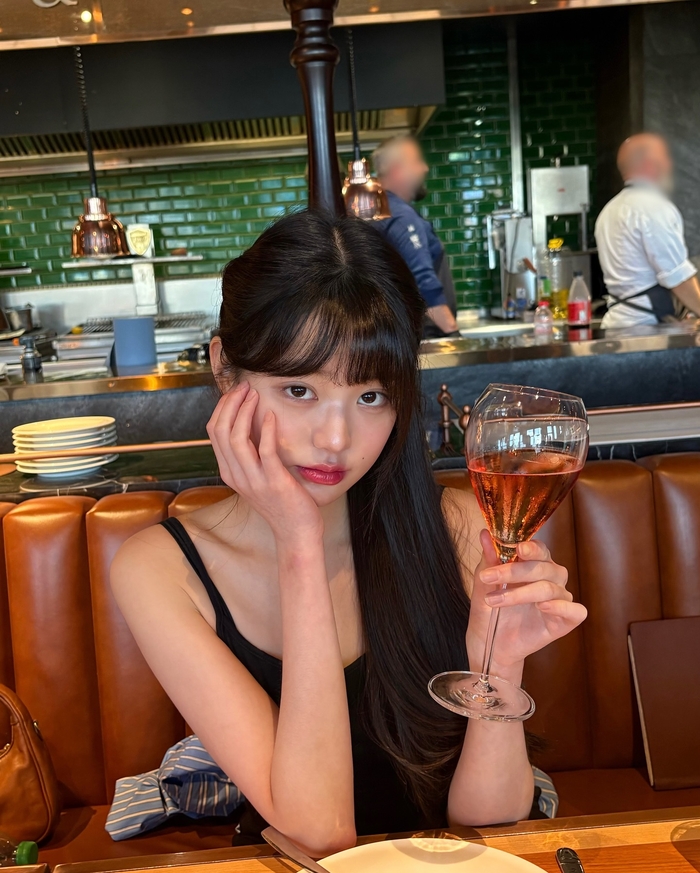 사진 속 장원영은 세련된 블랙 슬리브리스 톱에 긴 생머리를 자연스럽게 늘어뜨린 모습으로, 고급 레스토랑에서 여유롭게 와인과 맥주를 즐기는 모습을 선보였다.