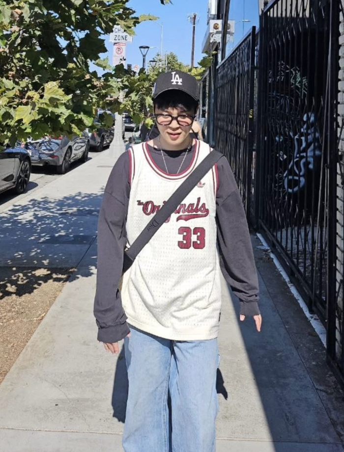 사진 속 지민은 빈티지한 감성이 돋보이는 농구 유니폼 레이어드 스타일에 연청색 와이드 팬츠로 편안하면서도 트렌디한 실루엣 패션을 선보였다.