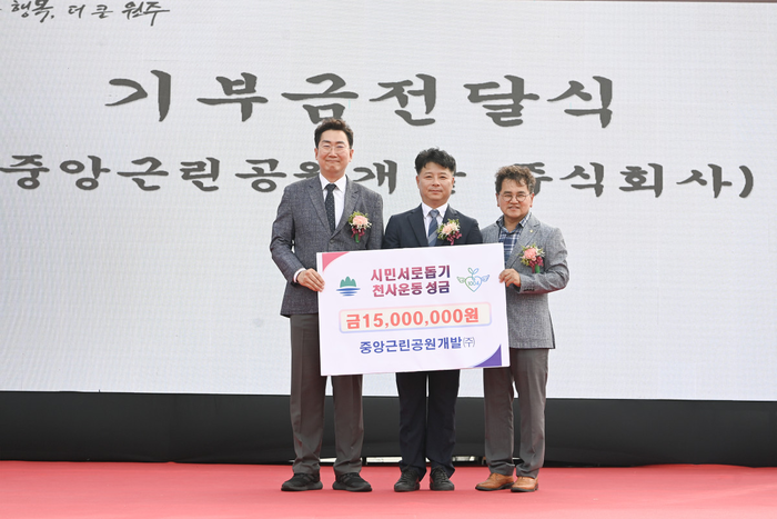 이날 전달식에는 원강수 원주시장과 중앙근린공원개발㈜ 관계자를 비롯해, 곽문근 원주시의회 부의장, 김종태 원주기업인단체연합회장, 박만호 천사운동본부 회장 등이 참석했다.