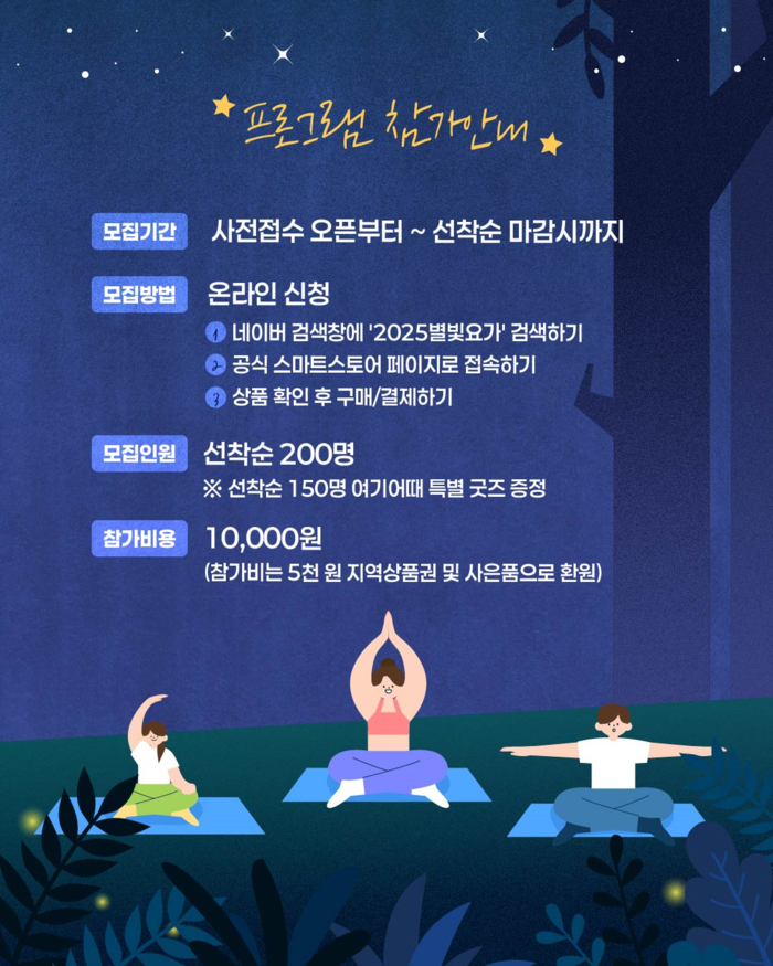 별빛 요가는 전문 요가 강사의 지도 아래, 참가자들이 밤하늘의 별빛과 편안한 음악 속에서 깊은 호흡을 이어가며 지친 일상 속 마음과 몸의 긴장을 풀고 평온을 되찾는 힐링 프로그램이다.