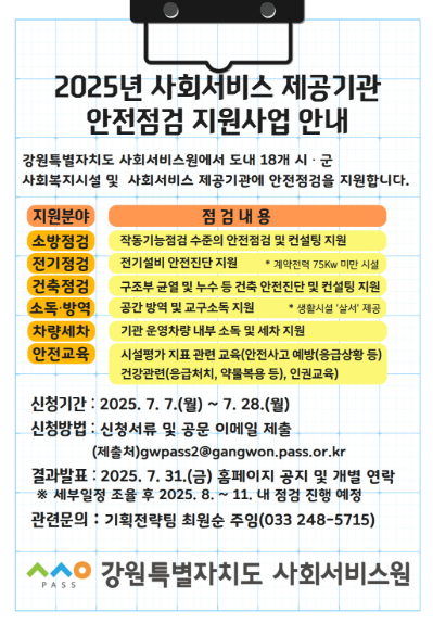 이은영 강원특별자치도 사회서비스원장은 “이번 안전점검 지원사업을 통해 종사자와 이용자 모두가 보다 쾌적하고 안전한 환경에서 사회서비스를 주고받을 수 있도록 실질적인 지원을 아끼지 않겠다”며, “도내 많은 기관들의 적극적인 관심과 참여를 기대한다”고 밝혔다.