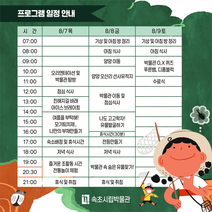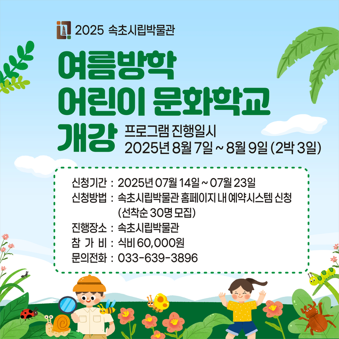 참가 대상은 초등학교 3학년부터 6학년까지이며, 모집은 오는 7월 23일까지 속초시립박물관 누리집을 통해 진행된다. 총 30명을 선착순으로 선정해 운영할 예정이다.
