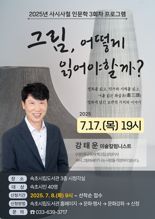 속초시립도서관 관계자는 “이번 특강은 명화를 매개로 삶의 깊이를 돌아볼 수 있는 소중한 시간이 될 것”이라고 전하며 많은 관심과 참여를 당부했다.