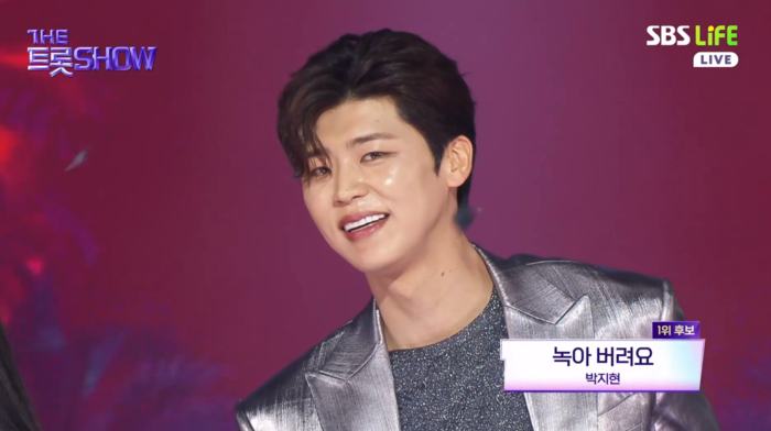 박지현은 지난 14일 방송된 SBS Life ‘더 트롯쇼’에서 김희재의 ‘바랑’, 이찬원의 ‘하늘 여행’과 함께 1위 후보에 올라, 총 11093점을 획득하며 최종 1위를 차지했다.