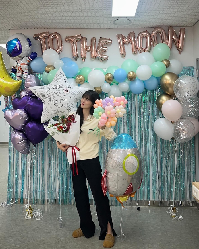 그는 풍선과 함께 환하게 웃는가 하면 ‘TO THE MOON’이라는 문구와 다채로운 풍선, 꽃다발을 들고 드라마의 여운을 전했다.