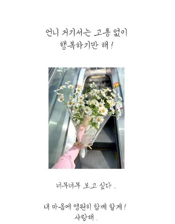 “본인은 그 큰 고통을 견디면서도 주변 걱정을 멈추지 않았다. 밥도 못 먹던 사람이 내 끼니는 꼭 챙기라며 자기 카드로 결제하라 했던 내 천사”라며 “진통제로 버티는 와중에도 ‘감사하다’는 말을 남기던 언니였다”고 적었다.