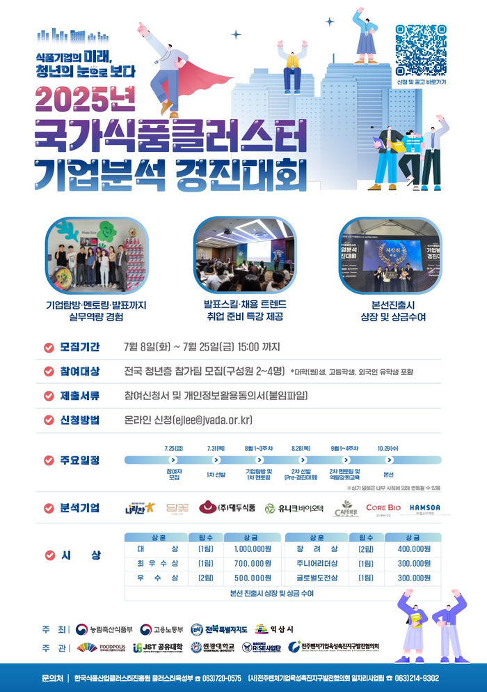 [스포츠서울ㅣ김기원기자]한국식품산업클러스터진흥원(이사장 김덕호, 이하 ‘식품진흥원’)이 농림축산식품부가 지원하는 ‘2025년 식품기업 인력수급 지원사업’에 따라, 전국 청년을 대상으로 ‘국가식품클러스터 기업 분석경진대회(이하 ‘경진대회’)’ 참가자를 7월 25일까지 모집한다고 밝혔다.