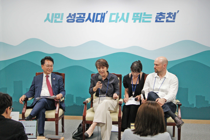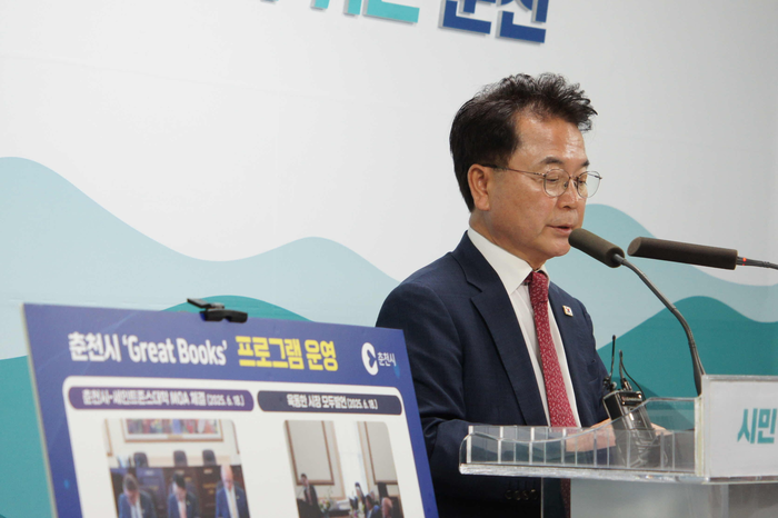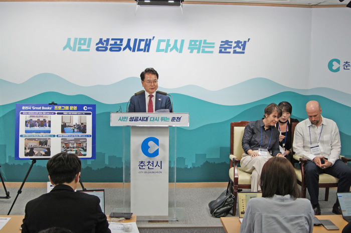 [스포츠서울ㅣ춘천=김기원기자]춘천시(시장 육동한)는 15일 시청 브리핑룸에서 ‘Great Books 프로그램’ 운영 현황과 향후 계획에 대해 브리핑을 진행했다. 이번 브리핑은 육동한 시장이 직접 발표자로 나서 고전 텍스트 기반의 토론 교육 프로그램 운영 경과와 성과, 향후 방향을 설명했다. 이 자리에는 미국 세인트존스대학의 Emily Langston 총장 선임고문, Nathan Shields 교수도 함께 참석해 질의응답에 참여했다.