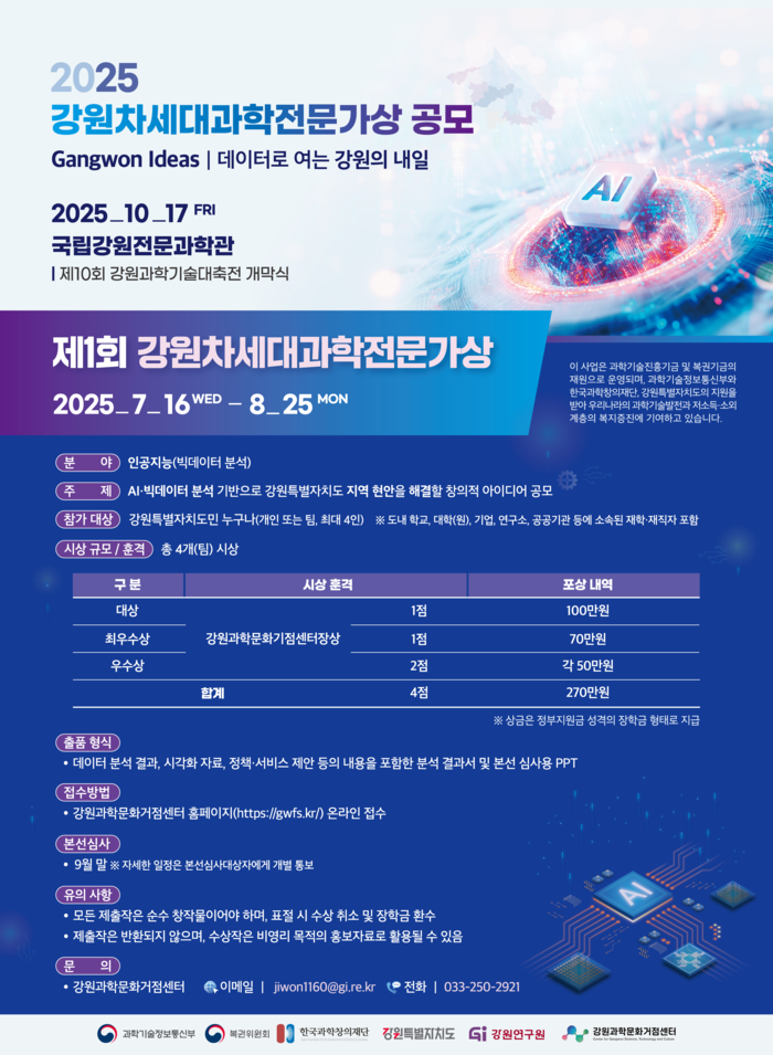 [스포츠서울ㅣ춘천=김기원기자]강원과학문화거점센터(정대현 센터장(강원연구원 현진권 원장))가 총상금 270만 원 규모의 『2025 Gangwon Ideas: 데이터로 여는 강원의 내일』 AI·빅데이터 분석 공모전을 개최한다. 이번 공모전은 강원특별자치도민을 대상으로 도내 과학기술 및 지역 사회 발전을 위한 창의적인 아이디어를 발굴하고 지원하기 위해 마련됐다.