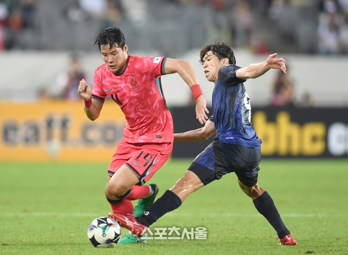 박승욱이 15일 용인 미르스타디움에서 열린 2025 동아시아축구연맹(EAFF) E-1 챔피언십(동아시안컵) 일본과 경기에서 상대 수비를 뚫고 드리블을 하고 있다.
