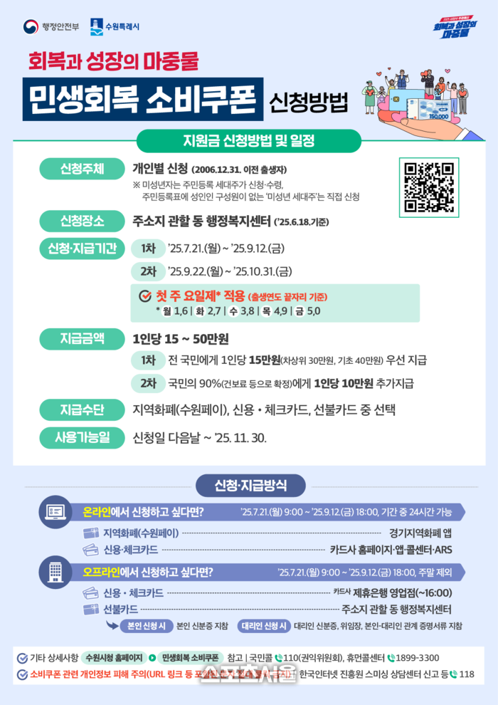 민생회복 소비쿠폰은 신용·체크카드, 선불카드, 수원페이 중 하나를 선택해 받을 수 있다. 온라인 신청은 수원페이(경기지역화폐) 앱, 신용·체크 카드사 홈페이지·앱·콜센터·ARS에서 할 수 있다.