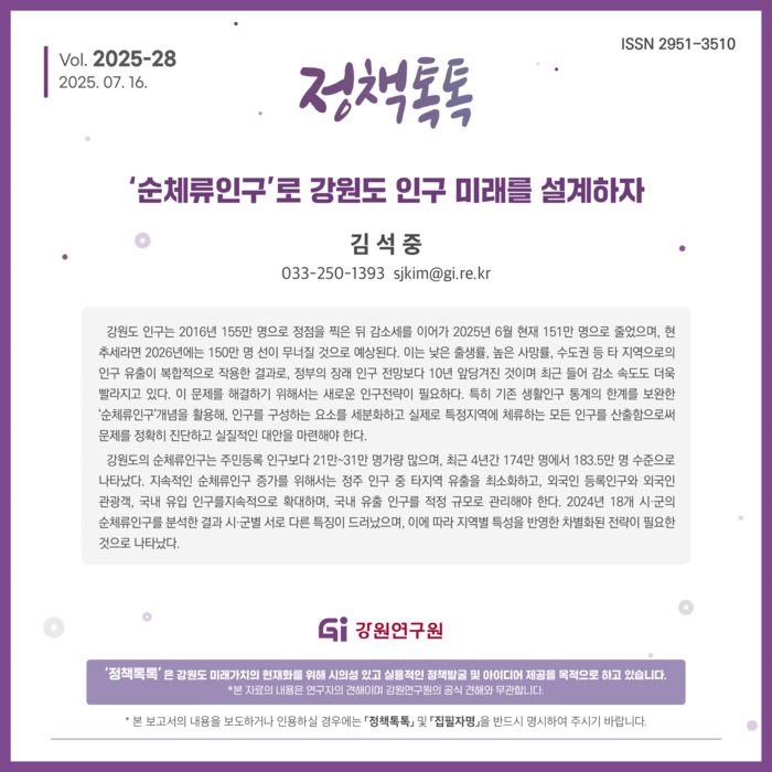 [스포츠서울ㅣ춘천=김기원기자]강원연구원(원장 현진권)은 「‘순체류인구’로 강원도 인구 미래를 설계하자」라는 제목으로 2025년 제28호 정책톡톡을 발간했다.