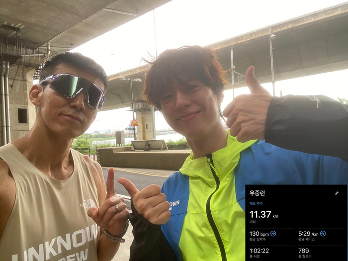 함께 공개된 사진에서 션은 ‘UNKNOWN CREW’ 티셔츠 차림으로, 박보검은 눈에 띄는 형광 노랑과 파랑 컬러의 러닝 점퍼를 입고 밝은 표정으로 엄지손가락을 치켜들고 있다.