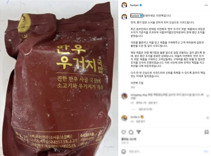 이연복 셰프는 16일 자신의 SNS를 통해 “좋지 않은 소식으로 찾아뵙게 되어 진심으로 죄송하다”고 운을 뗐다. 그는 “최근 판매된 ‘한우 우거지 국밥’ 제품에서 대장균 수치 기준 초과로 인해 식약처로부터 판매 중단 조치를 받았다”며 “이유를 불문하고 저를 믿고 구매해주신 모든 고객께 실망과 불편을 드린 점 진심으로 사과드린다”고 밝혔다.