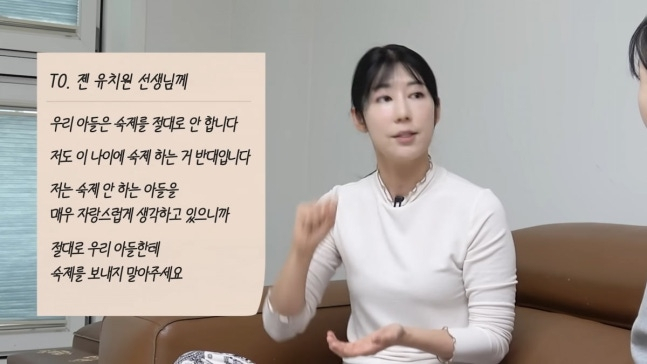 영상에서 사유리는 아들 교육법을 묻자 “아들 젠에게 절대 숙제를 시키지 않는다”며 “아들이 다니는 영어 유치원 측에 ‘숙제를 안 하는 아들을 자랑스럽게 생각하니, 절대 숙제를 보내지 말아 달라’고 썼다”며 억지로 숙제를 시키면 언어에 대한 흥미가 떨어질까 봐 걱정됐다“고 말했다.