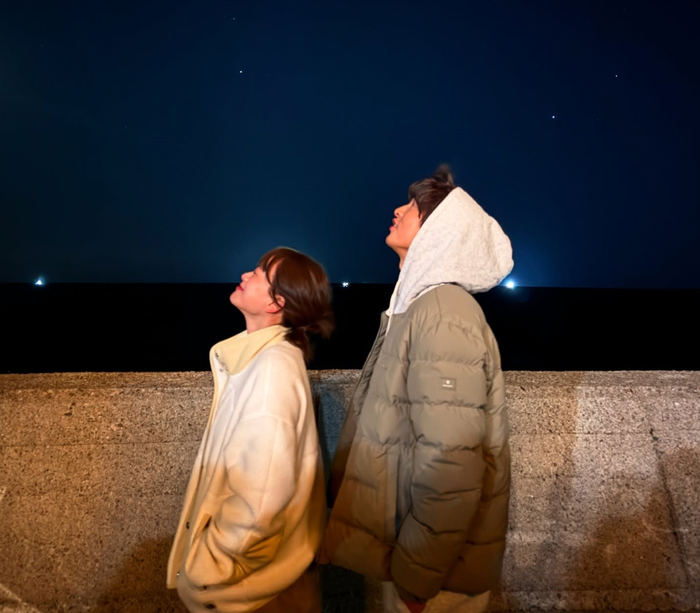 공개된 사진에서 두 사람은 두툼한 외투 차림으로 어깨를 맞대거나 나란히 밤하늘을 올려다보며, 친근하고 사랑스러운 분위기를 자아내고 있다. 천우희는 브이 포즈를 취해 여유 있고 밝은 미소를 드러내 현장의 따뜻한 무드를 전했다.