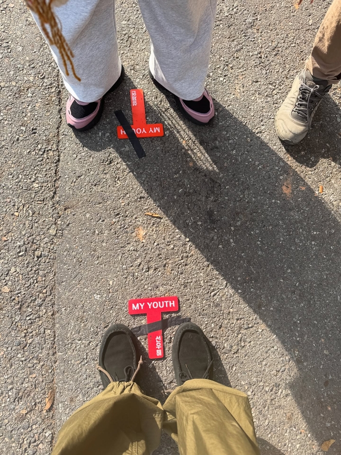 또 다른 사진에서는 두 사람이 ‘MY YOUTH’가 적힌 바닥 표식을 중심으로 마주 선 채, 촬영 현장의 소소한 뒷모습 또한 엿볼 수 있다.