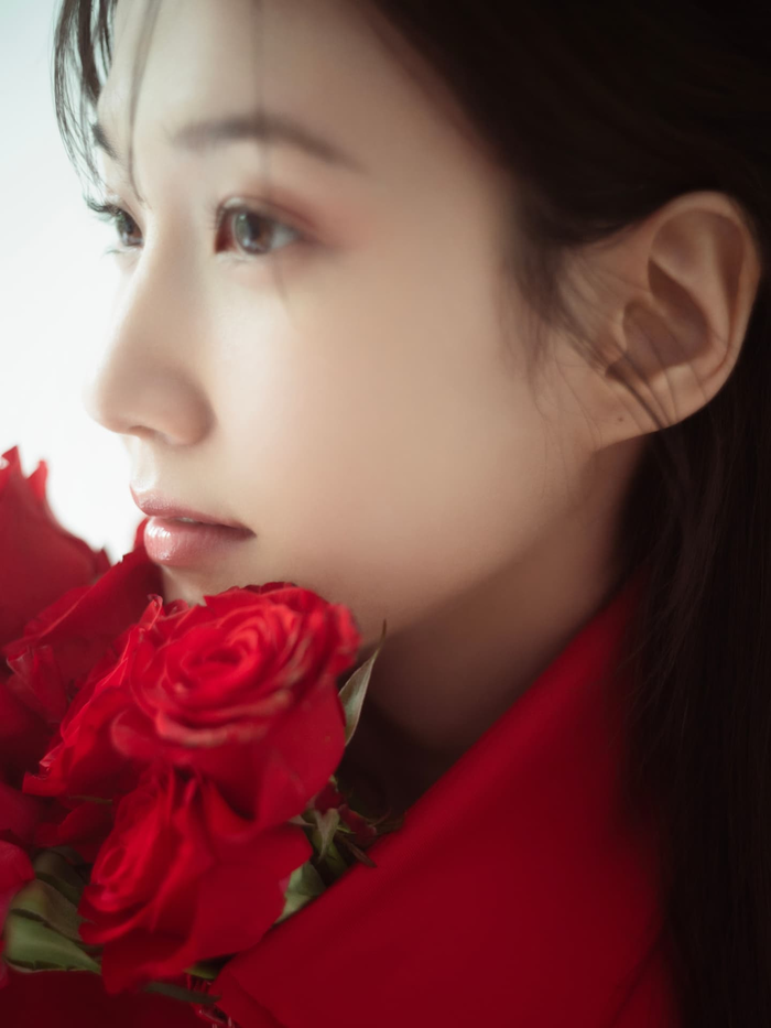 붉은 장미를 품에 안고 있는 모습에서는 감성적이고 성숙한 분위기를, 캐주얼한 셔츠와 야구 모자를 쓴 컷에서는 발랄하고 자연스러운 매력을 각각 드러냈다.