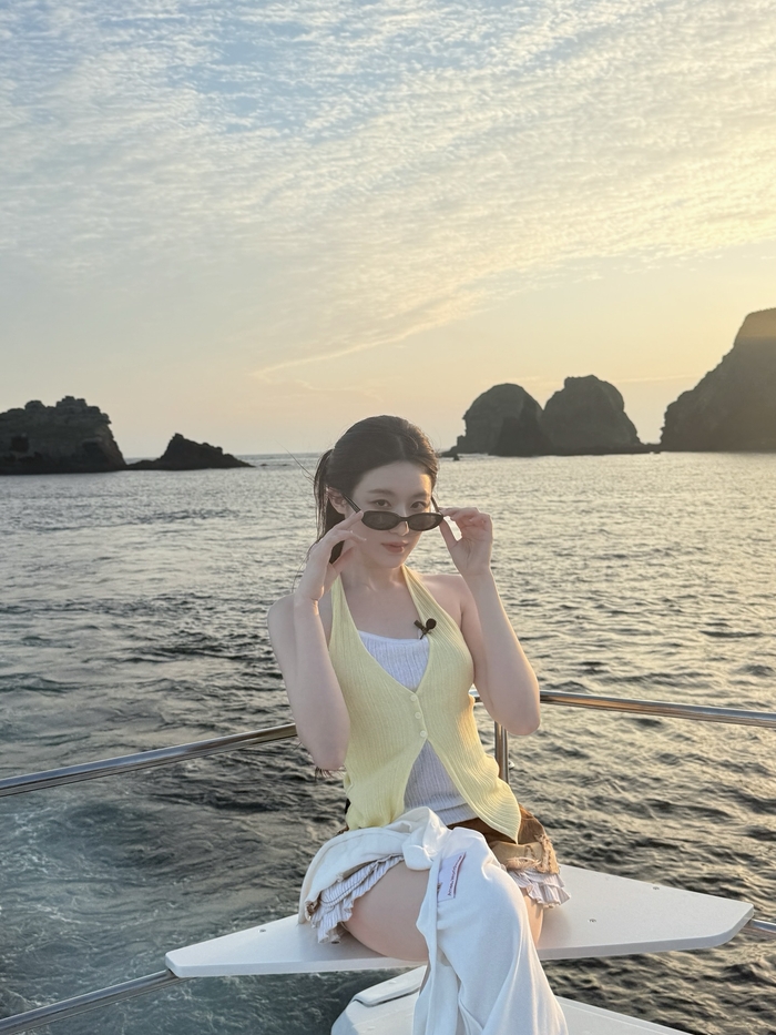공개된 사진 속 슈화는 해질녘 푸른 바다와 함께 요트 및 해안가에 앉아 고운 실루엣을 자랑한다.