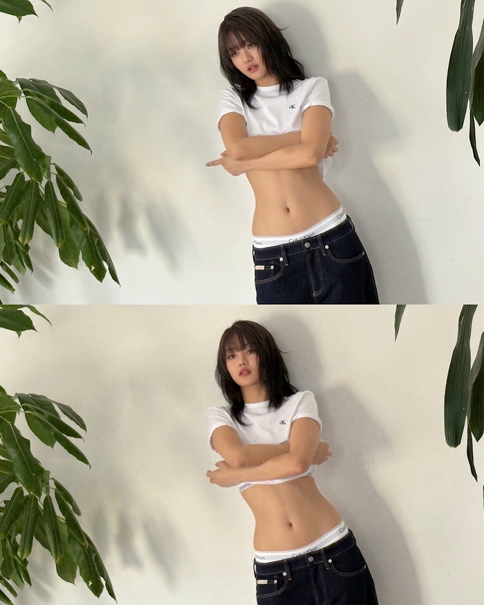 민니는 화이트 크롭티와 로우라이즈 진, 그리고 캘빈클라인 언더웨어 조합으로 군더더기 없는 S라인과 탄탄한 복근을 과감히 드러냈다.