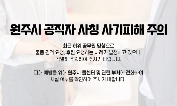 원주시 관계자는 “시민들의 추가 피해를 막기 위해 원주경찰서에 수사를 의뢰했다”며 “수상한 전화나 공문서를 받으면 즉시 원주시에 사실 여부를 확인해 주시길 바란다”고 당부했다.