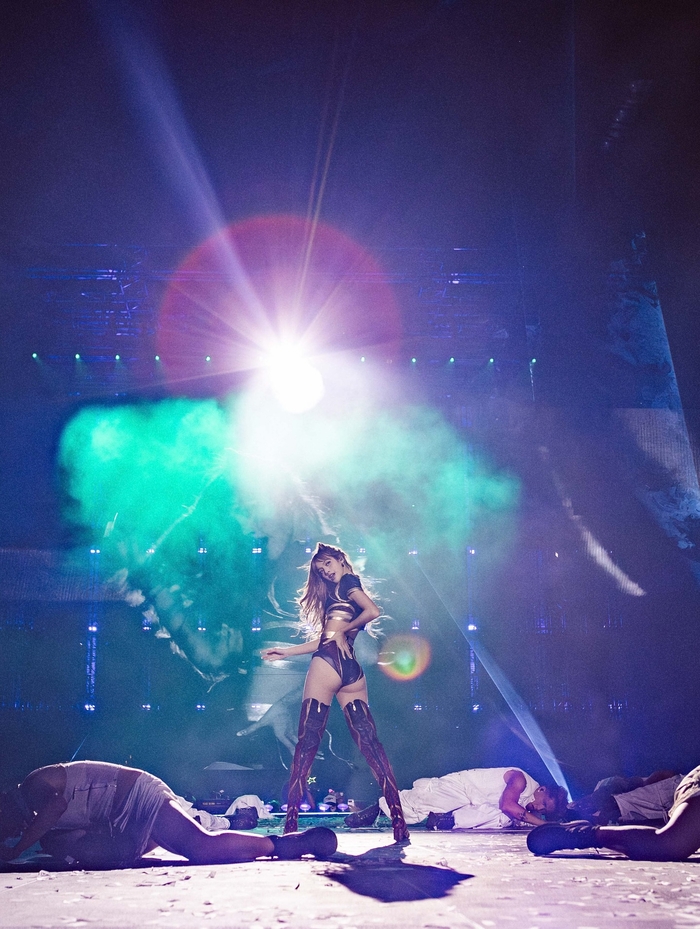 사진 속 리사는 강렬한 조명과 거대한 관중석을 배경으로, 스테이지 위에서 다양한 퍼포먼스를 선보이고 있다.