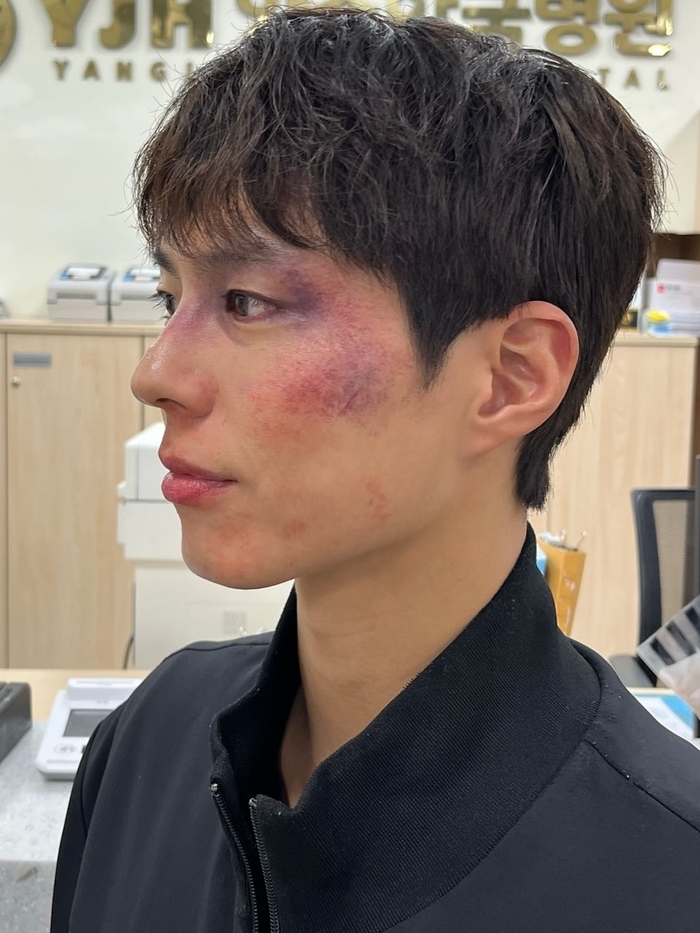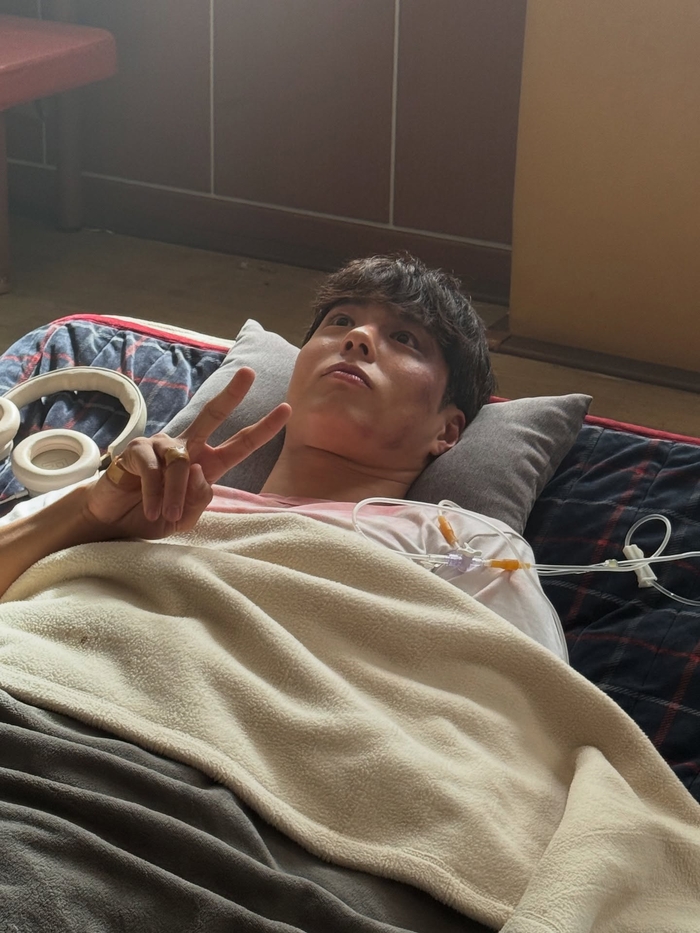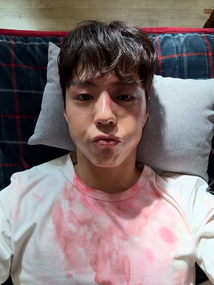 공개된 사진 속 박보검은 최근 화제의 드라마 ‘굿보이’에서 보여준 특수분장을 한 모습으로 등장한다. 한 사진에서는 티셔츠에 붉은 얼룩이 묻은 채 침대에 기대 누워있어 격렬한 촬영을 암시한다. 그는 링거를 맞으며 침대에 누워서도 환한 미소와 함께 손가락으로 브이(V) 포즈를 취하며 유쾌함을 잃지 않아 촬영장의 밝은 분위기가 고스란히 전해진다.
