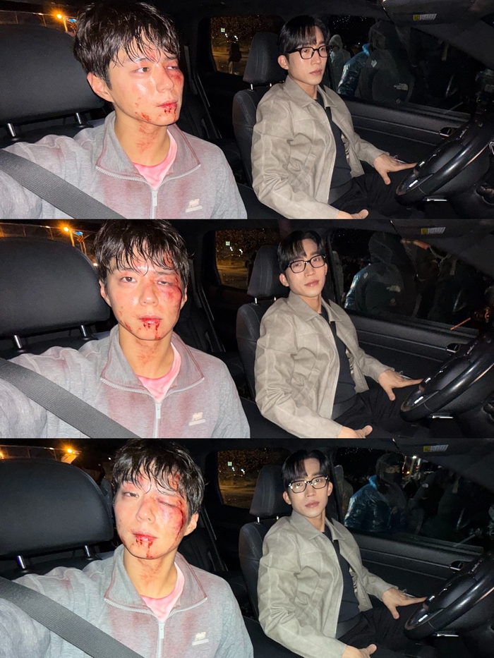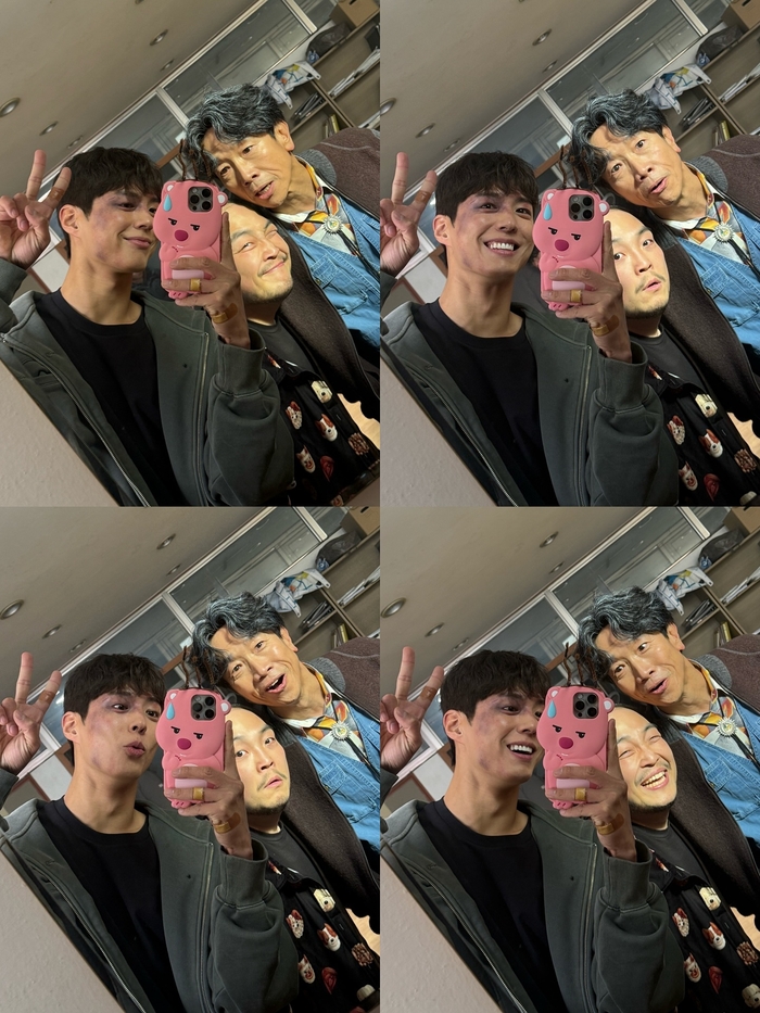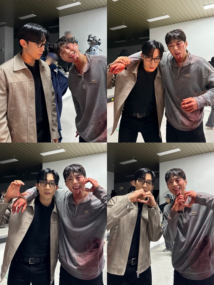 또한, 촬영 현장에서 분장을 한 채 동료와 나란히 하트, 브이(V) 포즈를 취하며 유쾌한 분위기를 자아낸다. 분장의 섬세한 표현과 박보검 특유의 밝은 미소가 어우러져, 고된 촬영 중에도 팀원들과 즐거운 추억을 남기는 프로페셔널함이 느껴진다.