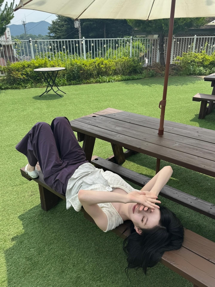 햇살 아래 자연스럽게 긴 머리를 만지며 환한 미소를 짓거나, 벤치에 누워 밝고 싱그러운 표정을 짓고 있다.