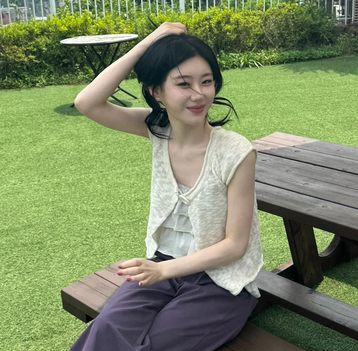 공개된 사진 속 채령은 푸른 잔디밭과 나무가 어우러진 야외 벤치에 앉아 다양한 포즈를 취하고 있다.