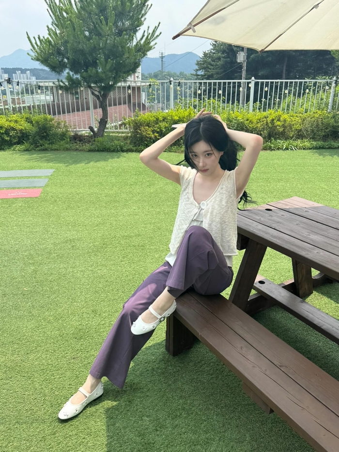 채령은 아이보리 컬러의 니트 가디건과 러플 포인트 나시, 보랏빛 와이드 팬츠에 귀여운 화이트 플랫슈즈를 매치해 산뜻하고 청순한 느낌을 자아냈다.