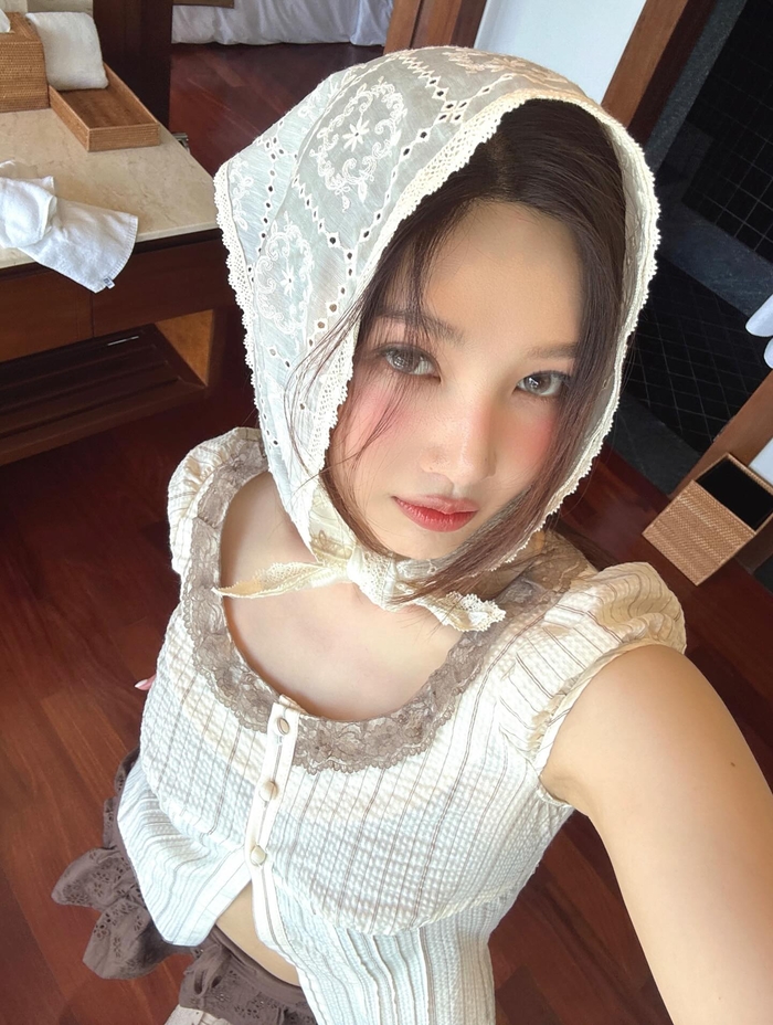 공개된 사진 속 조이는 레이스와 자수 디테일이 돋보이는 흰색 스카프를 머리에 두르고 소녀미 넘치는 스타일을 완성했다.