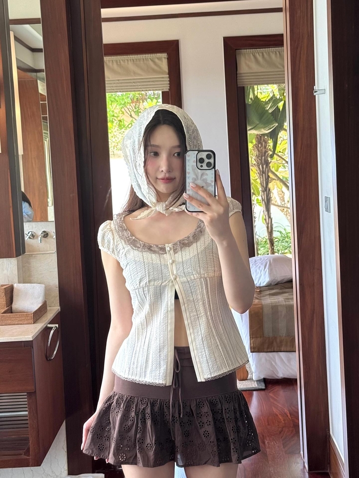 또한, 크림색 버튼업 블라우스와 브라운 미니 스커트를 매치해 산뜻한 패션을 완성했다.