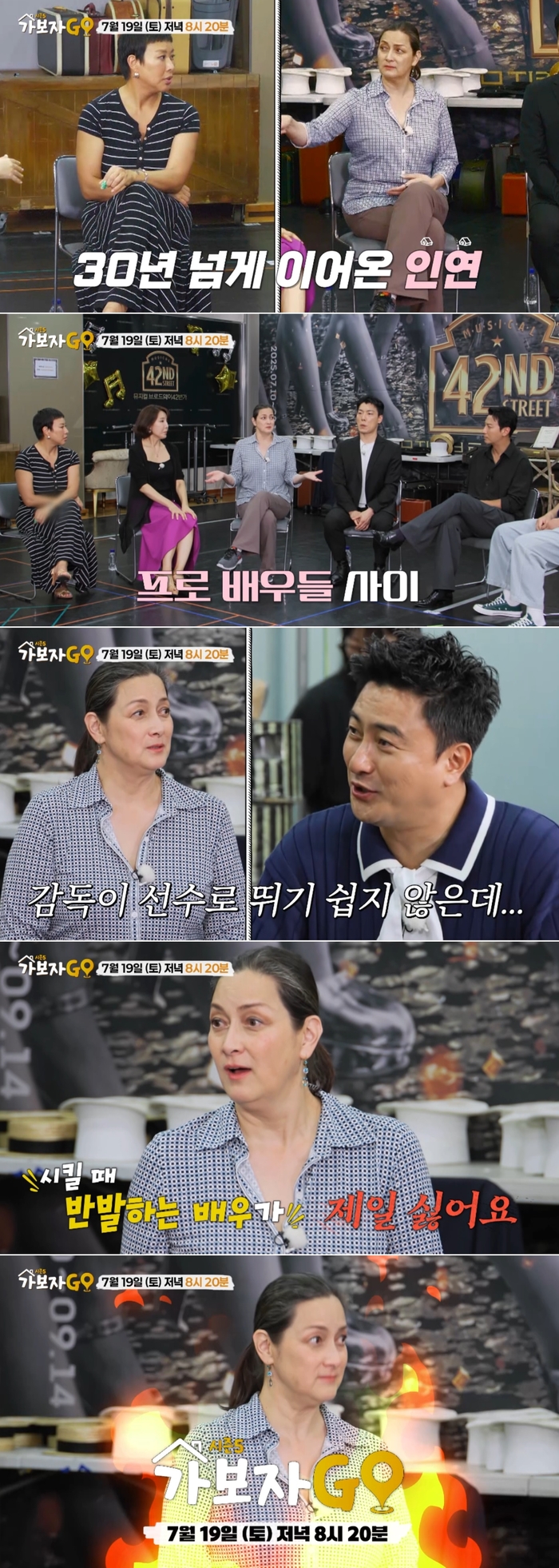 19일 방송하는 MBN ‘가보자GO’ 시즌5 3회에서는 뮤지컬 ‘브로드웨이 42번가’ 팀의 연습 현장이 전격 공개된다. 선공개 영상에서는 전수경, 정영주, 양준모, 박건형은 물론, 연출가에서 배우로 변신한 박칼린까지 가세해 눈길을 끈다.